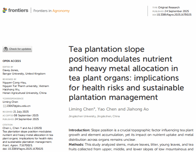 (本网讯:生环学院)近日,我校生物与环境工程学院青年教师陈丽明博士,以第一作者和通讯作者的身份,在农林科学领域JCR分区ESCI一区的《Frontiers in Agronomy》国际期刊上,发表了题为“Tea plantation slope position modulates nutrient and heavy metal allocation in tea plant organs: implications for health risks and sustainable plantation management”的研究成果,景德镇学院为该论文的唯一署名单位。