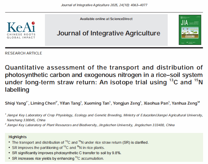 (本网讯:生环学院)近日,我校生物与环境工程学院青年教师陈丽明博士,与江西农业大学研究团队合作,在农林科学领域国际权威期刊《Journal of Integrative Agriculture》上发表题为“Quantitative assessment of the transport and distribution of photosynthetic carbon and exogenous nitrogen in a rice–soil system under long-term straw return: An isotope trial using 13C and 15N labelling”的研究成果。