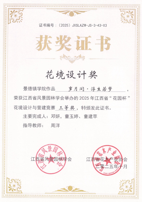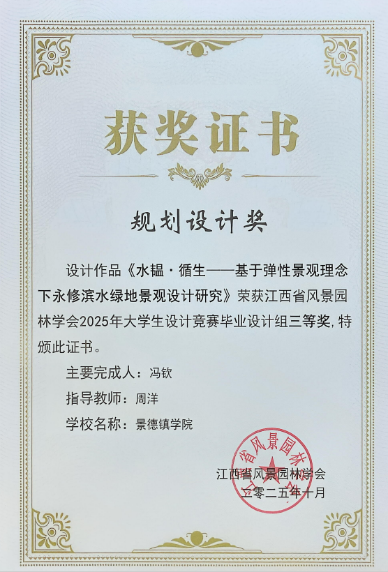 此外,由青年教师周洋指导的学生作品分别获得江西省风景园林学会2025年大学生设计竞赛毕业设计组三等奖一项,及2025年江西省“花园杯”花境设计与营建竞赛三等奖两项。充分展示了我院师生在专业学科竞赛中的实力。