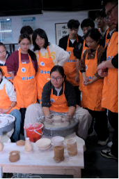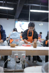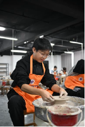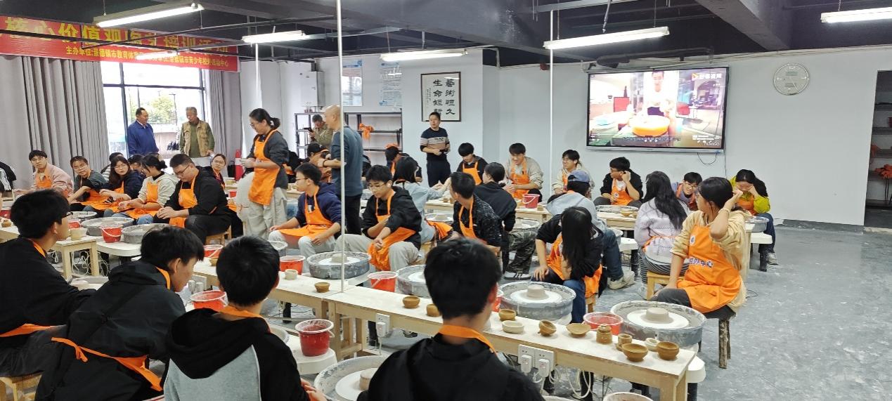 活动最后,陶艺体验环节在专业工坊内温馨开启。在牛海亮老师和雷鑫老师的细致示范与手把手指导下,同学们分组投入拉坯与塑形实践。拉坯区里,转盘缓缓转动,同学们屏息凝神,双手轻扶陶泥,在一次次调整与按压中,将松软的泥料塑造成古朴的碗、灵动的杯;塑形台前,大家发挥创意,指尖翻飞,或捏出憨态可掬的小动物,或雕出简约雅致的花纹,让平凡的陶泥在掌心绽放出独特形态。亲身实践中,同学们不仅体会到拉坯时“稳、准、轻”的技艺要领,更在反复打磨、修正作品的过程中,深刻领悟到陶瓷制作的不易,读懂了“匠心”二字所蕴含的专注、坚持与精益求精。