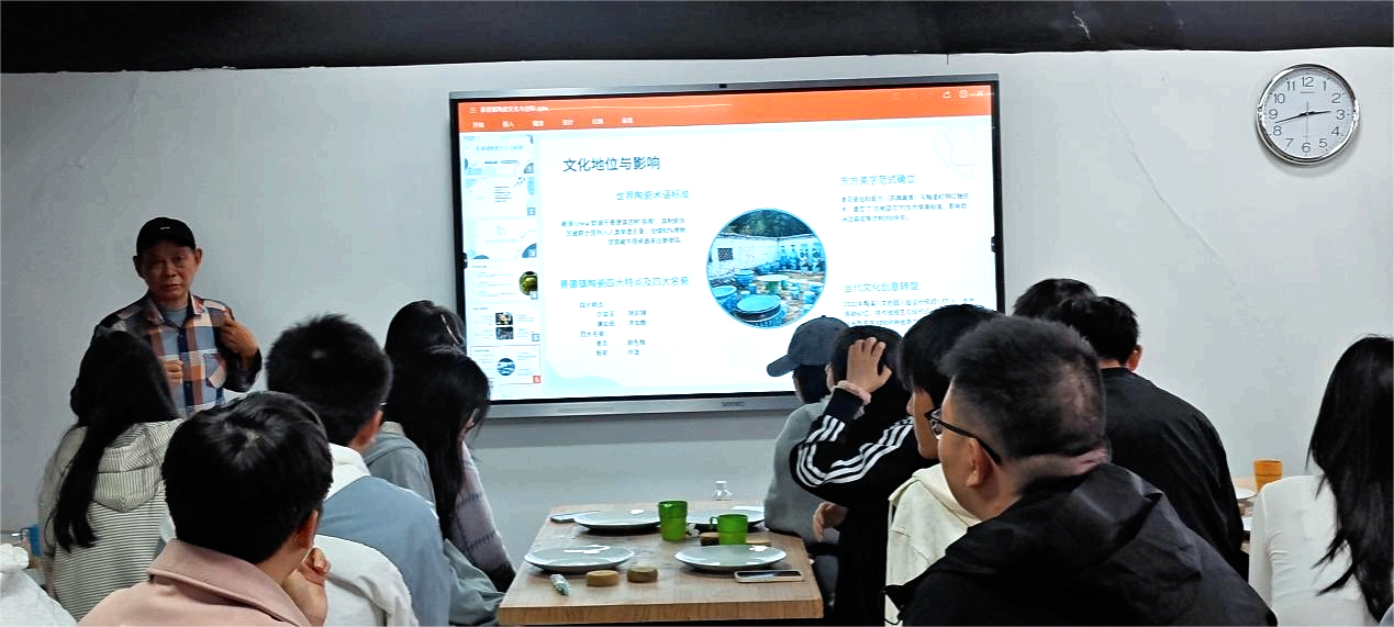 活动伊始,蔡新安老师在开场讲话中强调,本次活动以“解码陶瓷文脉,赋能青春传承”为核心,旨在通过陶瓷知识讲解与陶艺实践的双向联动,让青年学子沉浸式探寻陶瓷历史源流,读懂景德镇陶瓷的独特魅力,为陶瓷文化申遗凝聚青春共识。随后,刘建华老师以“景德镇陶瓷文化概述—传统制瓷工艺—景德镇陶瓷艺术特色—陶瓷现代创新与科技—景德镇陶瓷的国际影响—未来发展与挑战”为脉络,展开了一场专题讲解。他从汉代冶陶的萌芽时期讲起,历经唐宋青瓷、元青花、明清御窑的历史演进,清晰地梳理了陶瓷文化千年的发展脉络。重点聚焦于景德镇陶瓷的资源优势与文化影响力,深入剖析了青花瓷的素雅、玲珑瓷的剔透、粉彩瓷的艳丽、颜色釉瓷的莹润等艺术风格与文化内涵,并结合实物展品进行了详细解读。同时,他用“拉坯定形、利坯修细、施釉挂色、入窑烧制”四个步骤,通俗易懂地阐释了陶瓷制作的核心技艺,使抽象的工艺知识变得直观可感,为同学们构建起一个系统的陶瓷文化认知框架。